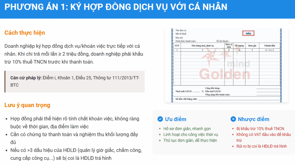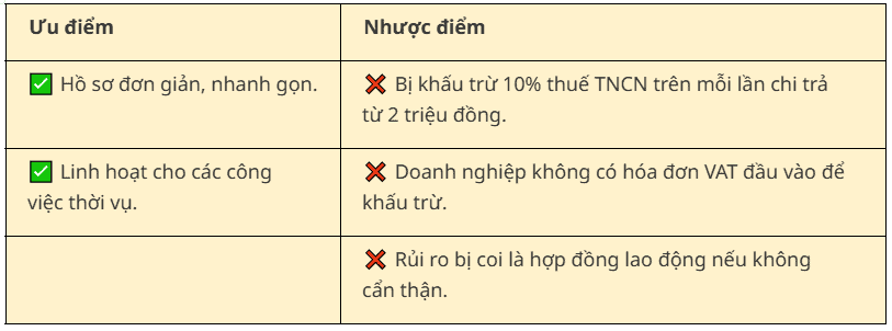 Nhận định: Đây là cách làm “ăn liền”, nhanh gọn nhất, phù hợp cho các công việc lặt vặt, thời vụ, không phát sinh thường xuyên. Ví dụ, bạn cần thuê một đội sơn nước lại văn phòng trong vài ngày, hay thuê một chuyên gia tư vấn một dự án ngắn hạn. Tuy nhiên, hãy cẩn thận! Nếu công việc có tính chất lặp đi lặp lại, kéo dài, và bạn quản lý họ về thời gian, công cụ làm việc… thì rất dễ bị cơ quan thuế “sờ gáy” và coi đó là hợp đồng lao động trá hình. Lúc này, rủi ro về bảo hiểm xã hội và các chế độ khác là rất lớn.