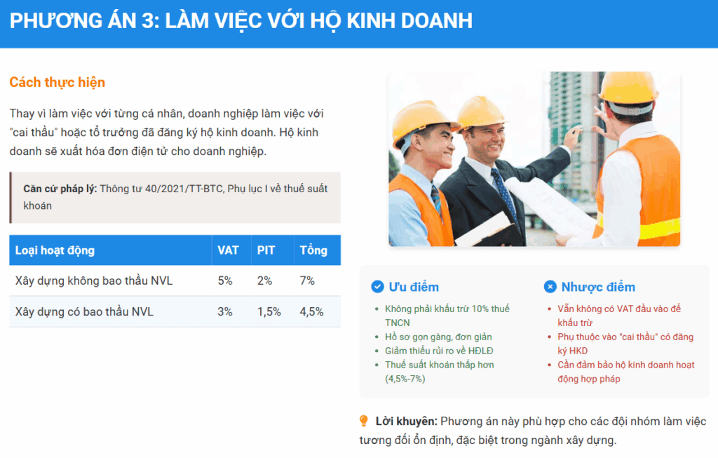 Nhận định: Đây là một bước tiến so với phương án 1. Bạn sẽ không còn phải lo lắng về việc khấu trừ 10% thuế TNCN nữa, hồ sơ cũng gọn gàng hơn rất nhiều. Cách này rất phổ biến trong ngành xây dựng. Tuy nhiên, điểm trừ lớn là bạn vẫn không có hóa đơn VAT để khấu trừ. Về bản chất, bạn đang “đẩy” nghĩa vụ thuế cho phía hộ kinh doanh, và họ sẽ nộp thuế theo một tỷ lệ nhất định trên doanh thu.