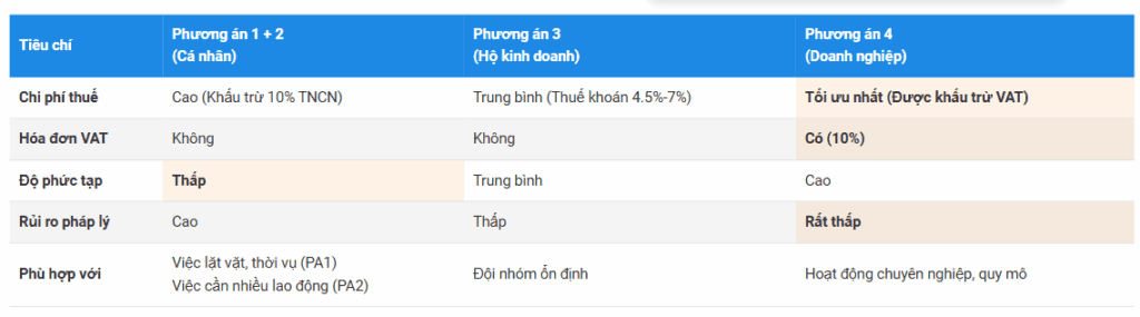 Lời khuyên: Nếu doanh nghiệp của bạn có quy mô, hoạt động bài bản và đầu ra chịu thuế VAT, hãy luôn ưu tiên phương án này. Chi phí ban đầu có thể cao hơn một chút, nhưng lợi ích về thuế và sự an toàn pháp lý về lâu dài là không thể đong đếm. Hãy xây dựng một mạng lưới các nhà thầu phụ uy tín để cùng nhau phát triển.