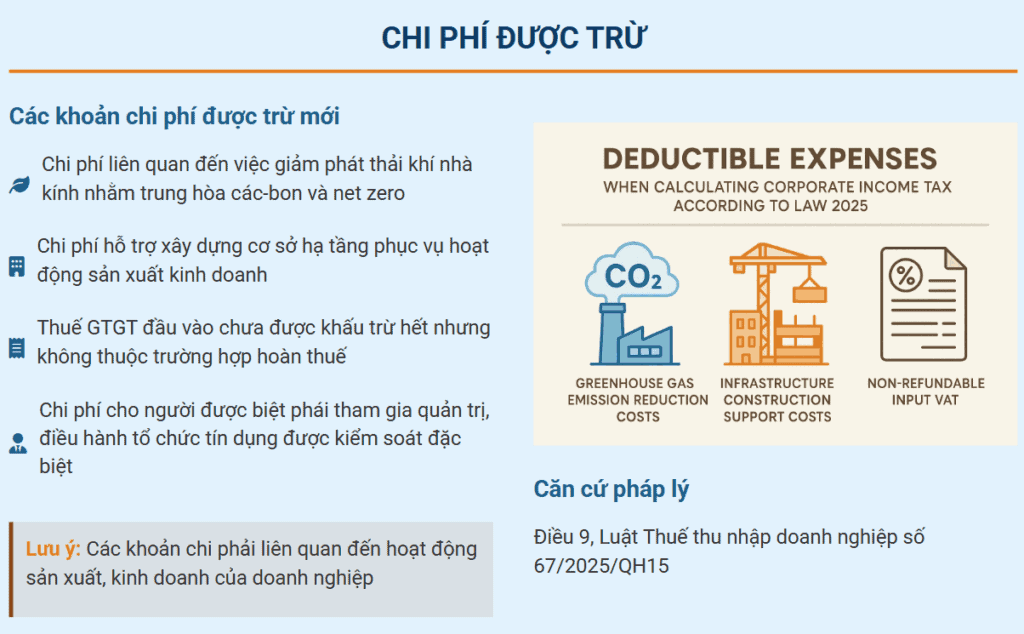 •Chi cho “Net Zero” và môi trường: Các khoản chi để giảm phát thải khí nhà kính, giảm ô nhiễm môi trường… liên quan đến hoạt động sản xuất kinh doanh sẽ được tính vào chi phí được trừ.