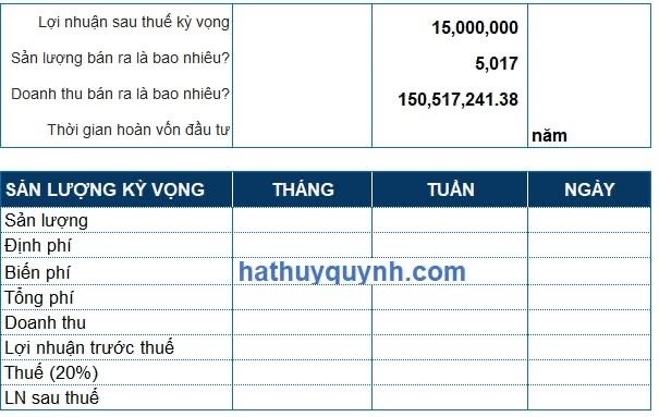 • Doanh thu tháng: 25.000đ x 23 phần/ngày x 30 ngày ≈ 17.250.000 VNĐ.
