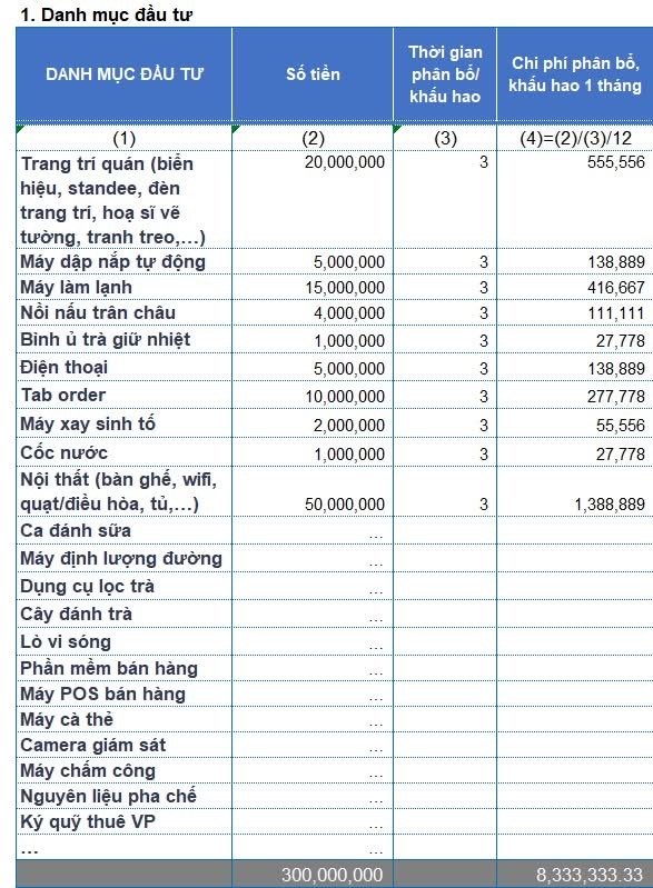 • Khấu hao tài sản: Bạn đầu tư 300 triệu cho việc sửa chữa, trang trí, mua sắm máy móc (máy pha chế, tủ lạnh, bàn ghế…). Chi phí này cần được phân bổ. Giả sử khấu hao trong 3 năm (36 tháng).