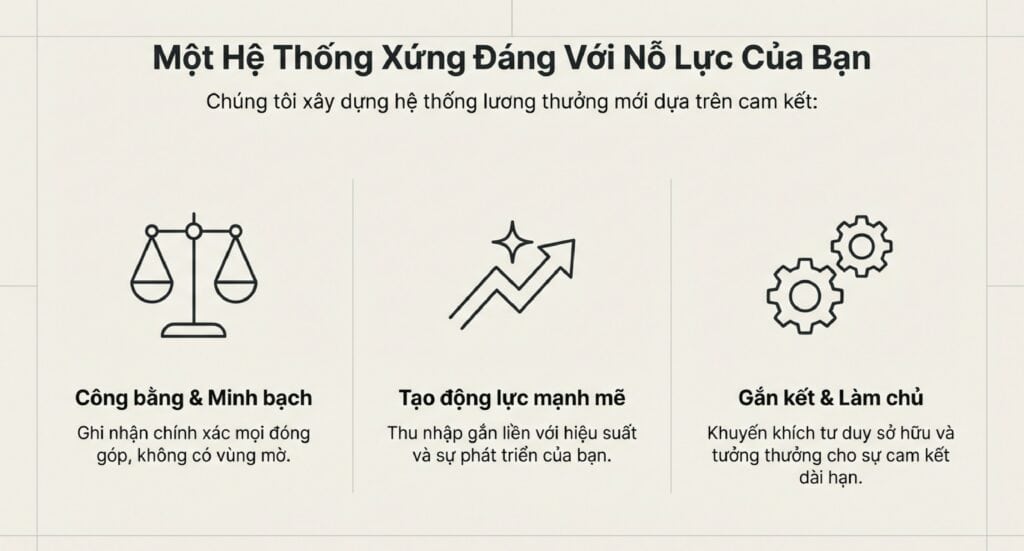 | P3 | Pay for Performance (Lương Hiệu suất) | Thu nhập biến đổi, gắn trực tiếp với mức độ hoàn thành KPI/OKR cá nhân. | Hàng tháng/Quý |