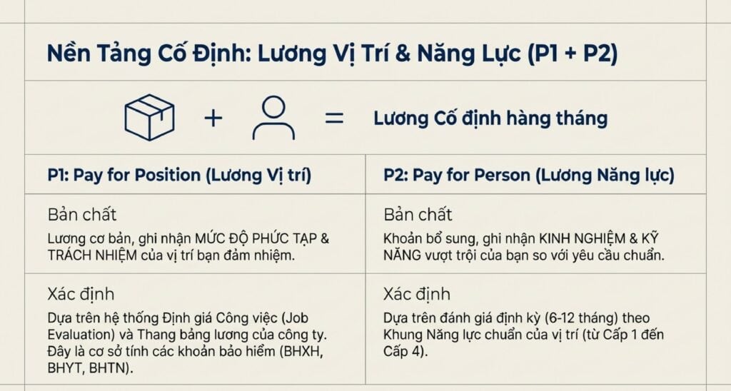 | P1 | Pay for Position (Lương Vị trí) | Lương cơ bản, đảm bảo mức sống tối thiểu, xác định theo giá trị công việc. | Hàng tháng |