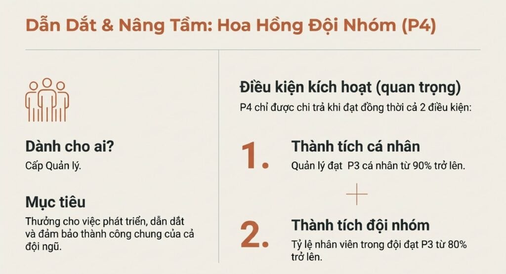 | P4 | Pay for Leadership (Hoa hồng Đội nhóm) | Khoản thưởng dành cho cấp quản lý, gắn với sự phát triển và hiệu suất chung của đội nhóm. | Hàng quý/Năm |