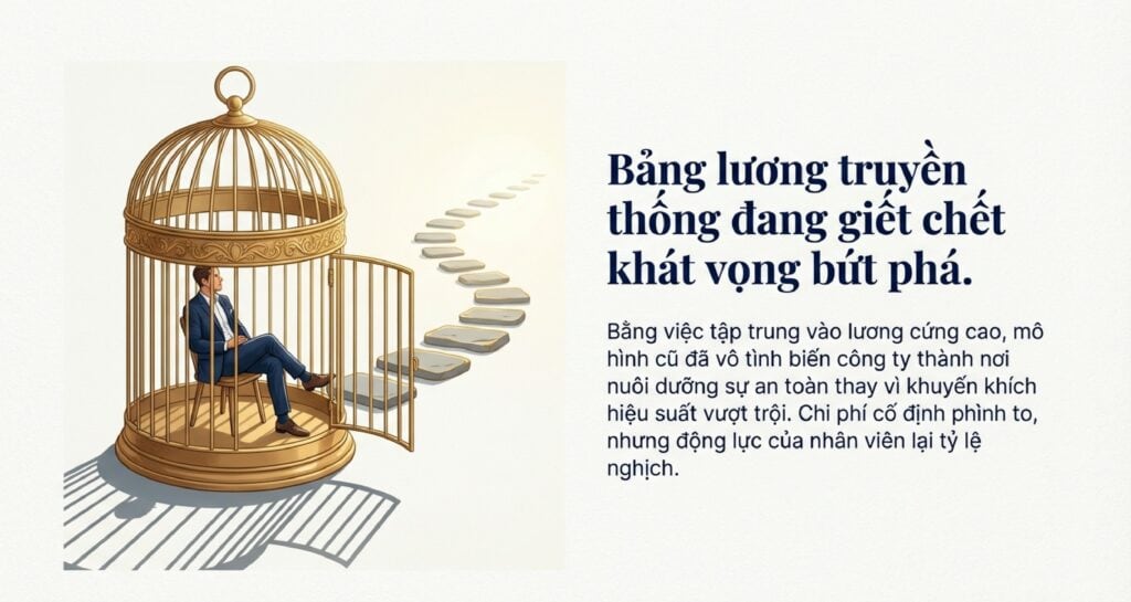 | Nhân viên Kinh doanh | Thấp (42.8%) | Cao (57.2%) | Khuyến khích tối đa hiệu suất cá nhân. Thu nhập phụ thuộc trực tiếp vào kết quả. |