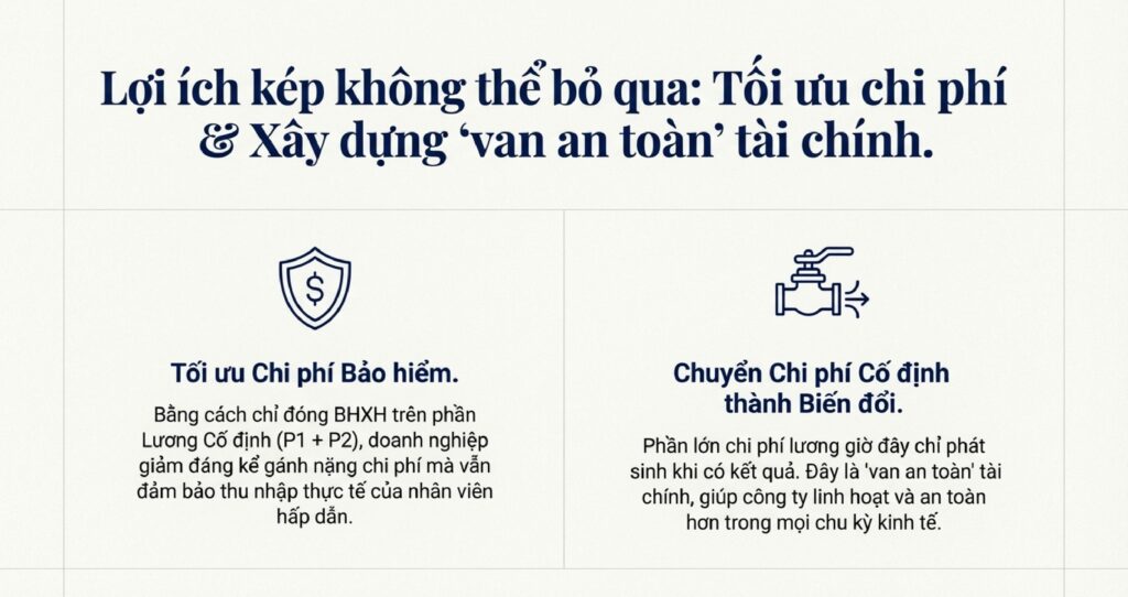Bảng tính mẫu dưới đây sẽ minh họa một cách trực quan, rõ ràng nhất về cách chúng ta có thể giảm chi phí cố định, tối ưu hóa chi phí bảo hiểm (vì chỉ đóng trên P1+P2), và quan trọng nhất là kích hoạt động lực làm việc của nhân viên, biến họ thành những “người làm chủ” thực thụ.