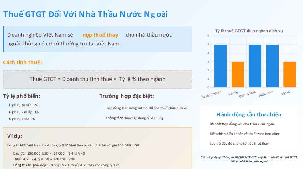 Giải thích đơn giản: Đây là phần liên quan đến “Thuế nhà thầu nước ngoài” (Foreign Contractor Tax – FCT), áp dụng cho các tổ chức, cá nhân nước ngoài có hoạt động kinh doanh tại Việt Nam nhưng không thành lập pháp nhân tại đây. Thuế GTGT trong trường hợp này thường được tính theo phương pháp trực tiếp trên doanh thu, với các tỷ lệ phần trăm khác nhau tùy thuộc vào ngành nghề.