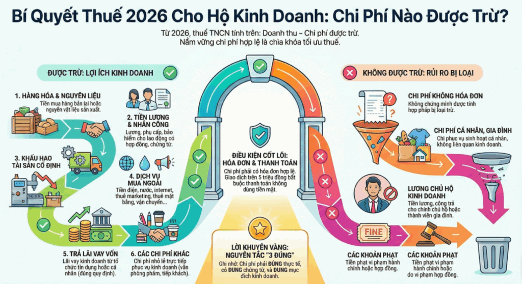Các khoản chi phí được trừ khi tính thuế hộ kinh doanh 2026 là các khoản chi phí thực tế phát sinh liên quan đến hoạt động sản xuất, kinh doanh, có đủ hóa đơn, chứng từ hợp pháp và chứng từ thanh toán không dùng tiền mặt đối với các khoản thanh toán từng lần có giá trị từ 05 triệu đồng trở lên, cụ thể như sau: