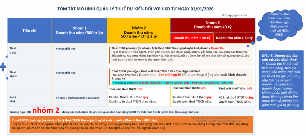 Từ năm 2026, Hộ Kinh Doanh nhóm 2 (nếu lựa chọn phương pháp lợi nhuận), và nhóm 3 sẽ chuyển sang phương pháp tính thuế dựa trên Doanh thu trừ Chi phí được trừ, thay vì phương pháp khoán hoặc tỷ lệ trên doanh thu như hiện tại. Điều này có nghĩa là, bạn cần phải quản lý chi phí một cách chặt chẽ và chính xác hơn bao giờ hết.