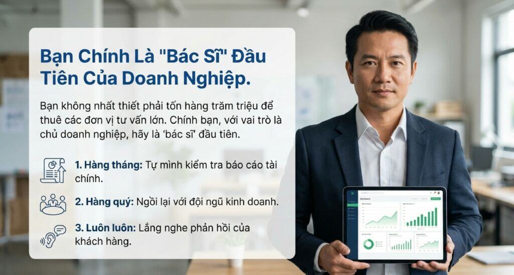- Đừng Đợi “Bác Sĩ” Bên Ngoài: Bạn không nhất thiết phải tốn hàng trăm triệu để thuê các đơn vị tư vấn lớn. Chính bạn, với vai trò là chủ doanh nghiệp, hãy là “bác sĩ” đầu tiên. Hãy tự mình thực hiện các “xét nghiệm” cơ bản hàng tháng, hàng quý: kiểm tra báo cáo tài chính, ngồi lại với đội ngũ kinh doanh, lắng nghe phản hồi của khách hàng.
