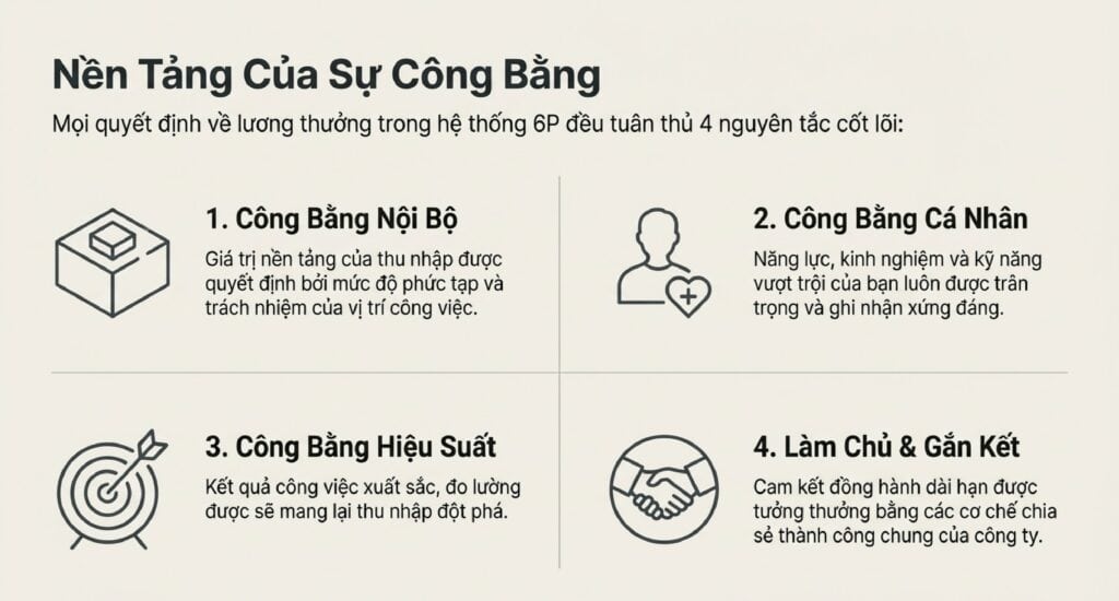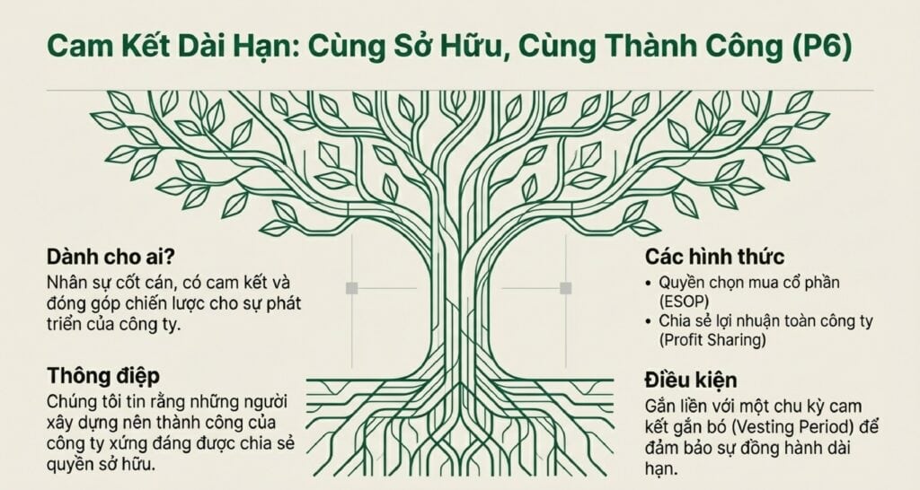 | P6 | Pay for Ownership (Chia lợi nhuận/Cổ tức) | Cơ chế thưởng dài hạn (ESOP, cổ tức), gắn kết nhân sự cốt cán với lợi nhuận toàn công ty. | Hàng năm/Chu kỳ dài hạn |