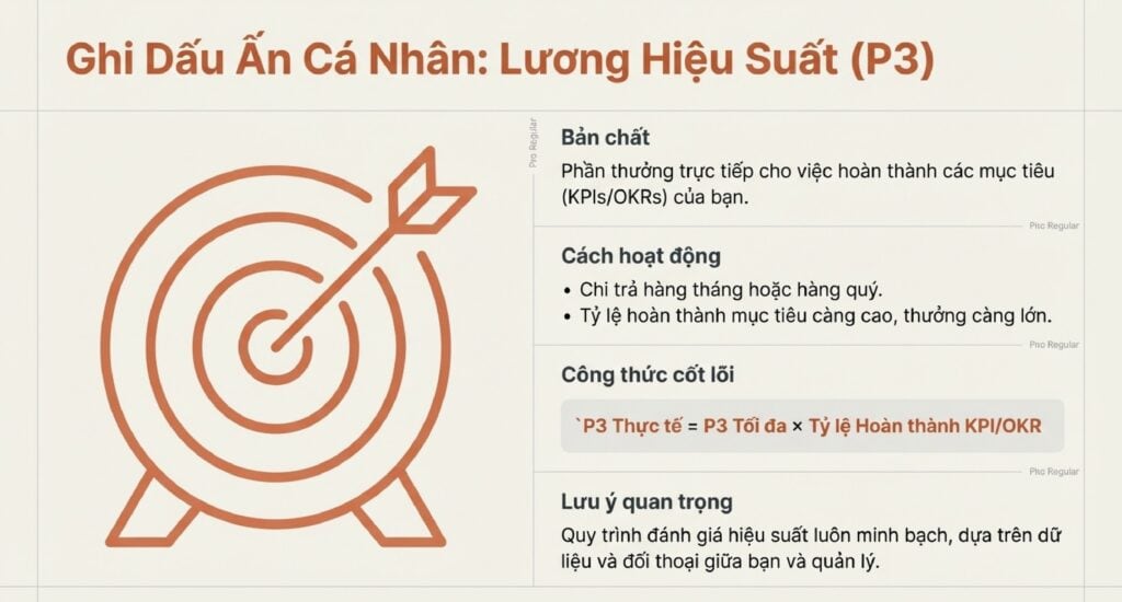 | P3 | Pay for Performance (Lương Hiệu suất) | Thu nhập biến đổi, gắn trực tiếp với mức độ hoàn thành KPI/OKR cá nhân. | Hàng tháng/Quý |