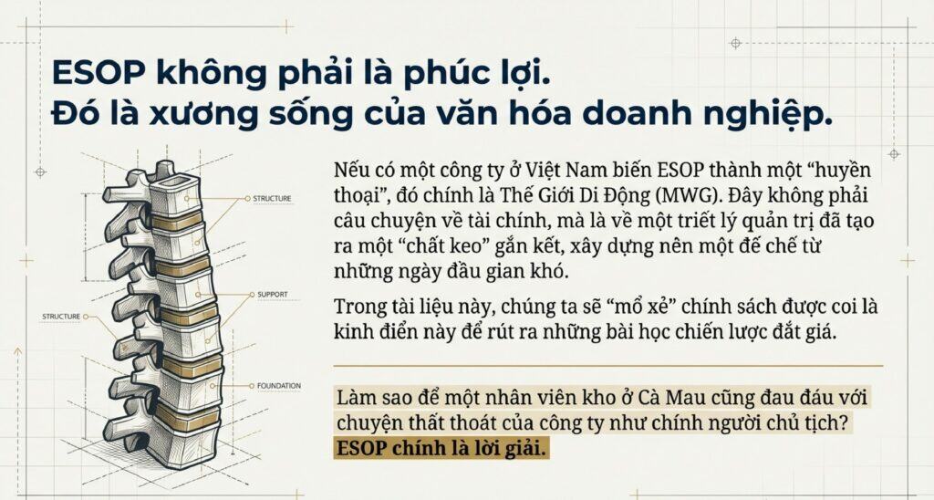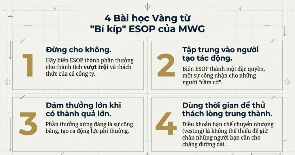 Câu chuyện của Thế Giới Di Động dạy chúng ta rằng, ESOP không chỉ là một kỹ thuật tài chính. Nó là nghệ thuật biến những người làm thuê thành người đồng hành, biến công ty thành một “liên minh” của những người cùng chung chí hướng, cùng nhau chiến đấu và cùng nhau chia sẻ vinh quang.