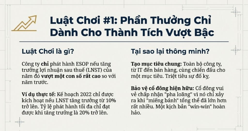 Đây là điểm khác biệt đầu tiên và thông minh nhất. MWG không phát hành ESOP một cách tùy tiện hàng năm. Họ đặt ra một “thử thách” cực lớn cho toàn bộ đội ngũ: