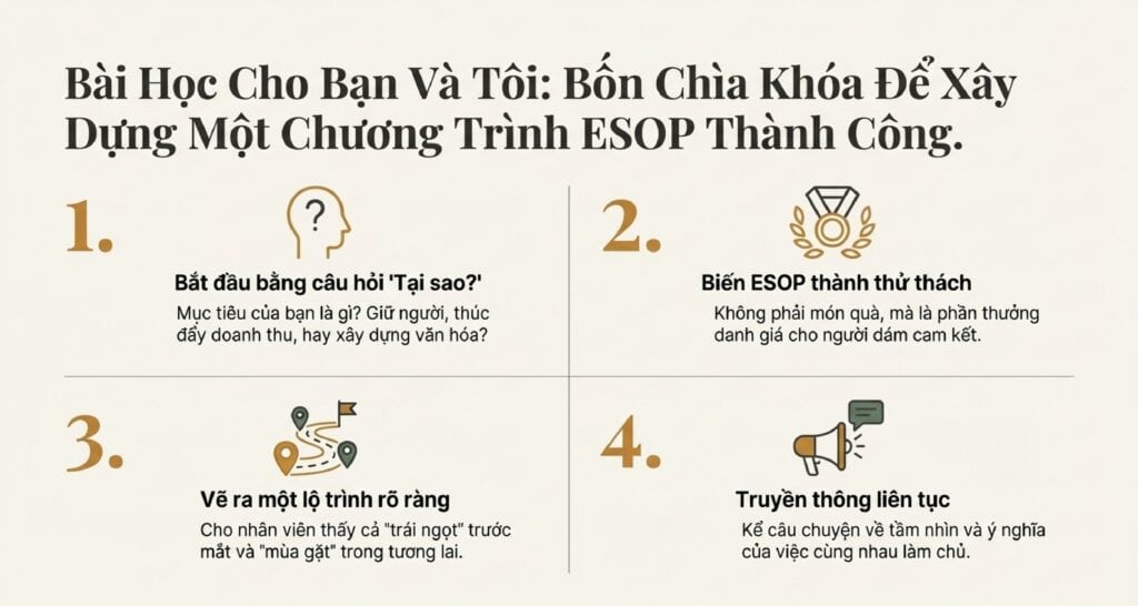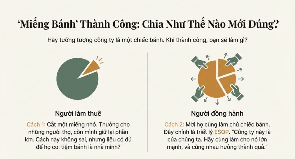 Đó là nỗi trăn trở của tôi nhiều năm về trước, và có lẽ, cũng là của bạn ngay lúc này. Và hành trình đi tìm câu trả lời đã dẫn tôi đến một khái niệm mang tên ESOP – không phải là một công thức tài chính phức tạp, mà là một triết lý về việc “chia sẻ cơ nghiệp”.