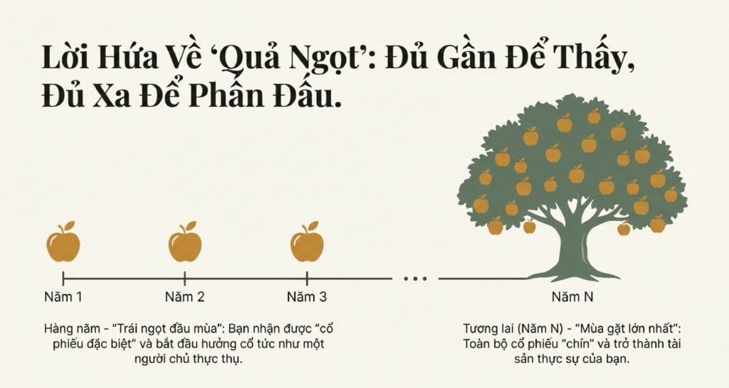 “Hàng năm, nếu bạn làm tốt, chúng tôi sẽ thưởng cho bạn một loại ‘cổ phiếu đặc biệt’. Bạn chưa thể bán nó ngay, nhưng bạn sẽ bắt đầu nhận được cổ tức, như một người chủ thực thụ. Đó là ‘trái ngọt’ đầu mùa.”