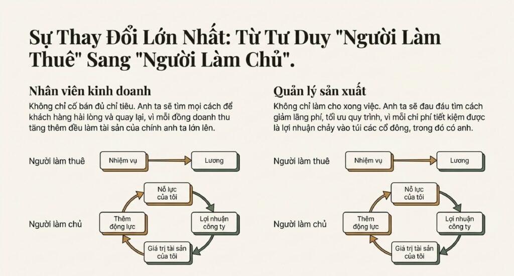 ESOP chính là cách làm thứ hai. Nó nói rằng: “Này anh em, công ty này không chỉ của riêng tôi. Nó là của chúng ta. Hãy cùng làm cho nó lớn mạnh, và khi giá trị của nó tăng lên, mỗi người trong chúng ta đều sẽ được hưởng thành quả xứng đáng.”