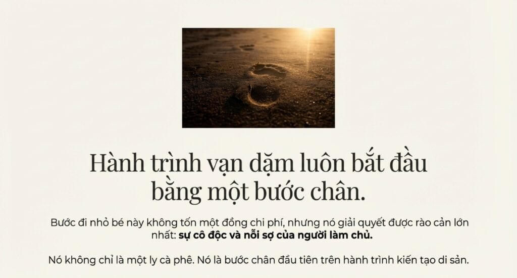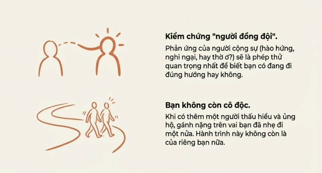 Bước đi nhỏ bé này không tốn một đồng chi phí nhưng nó giải quyết được rào cản lớn nhất: sự cô độc và nỗi sợ của người làm chủ. Từ cuộc trò chuyện đó, bạn sẽ có thêm dũng khí và một người đồng hành để cùng nhau tìm đọc sách, cùng nhau gặp luật sư, và cùng nhau bắt đầu những bước đi tiếp theo.