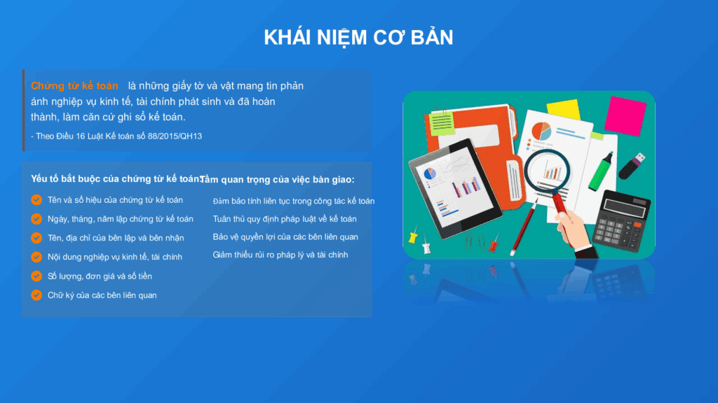 Theo quy định của Luật Kế toán số 88/2015/QH13 (có hiệu lực từ ngày 01/01/2017), việc lập, lưu trữ và bàn giao chứng từ kế toán không chỉ là nghĩa vụ pháp lý mà còn là yếu tố then chốt đảm bảo tính liên tục và minh bạch trong hoạt động tài chính của doanh nghiệp.