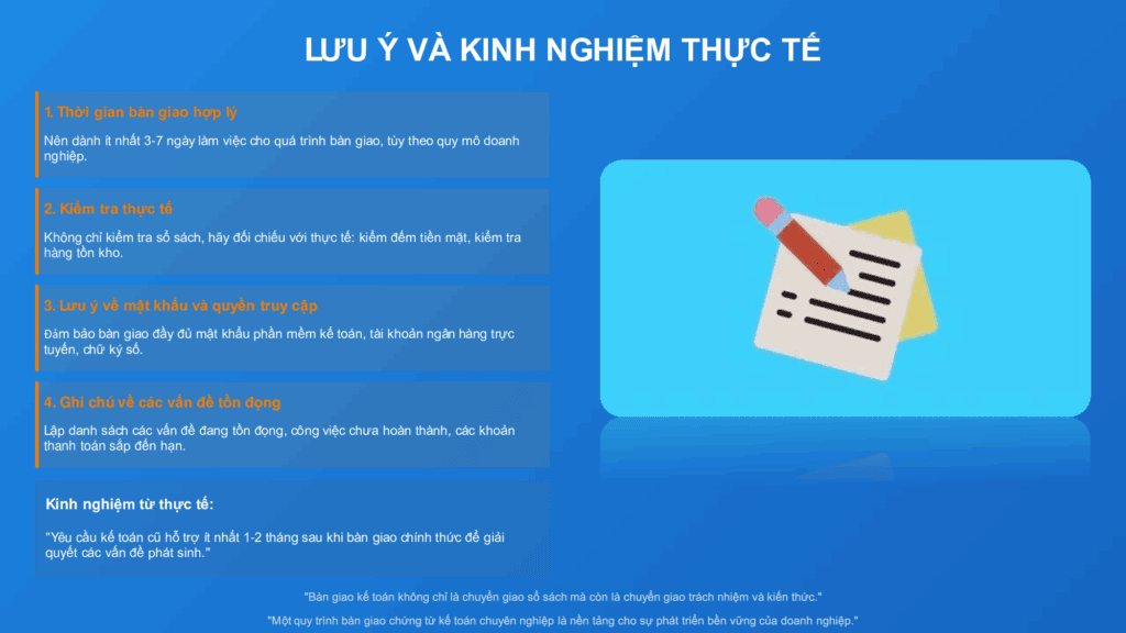 Từ góc độ thực tiễn, tôi nhận thấy rằng một quy trình bàn giao kế toán được thực hiện đúng cách sẽ mang lại những lợi ích to lớn: giúp kế toán mới nhanh chóng nắm bắt được tình hình tài chính của doanh nghiệp, tránh được những sai sót không đáng có, đảm bảo tính liên tục trong công tác kế toán, và quan trọng nhất là bảo vệ quyền lợi của tất cả các bên liên quan.