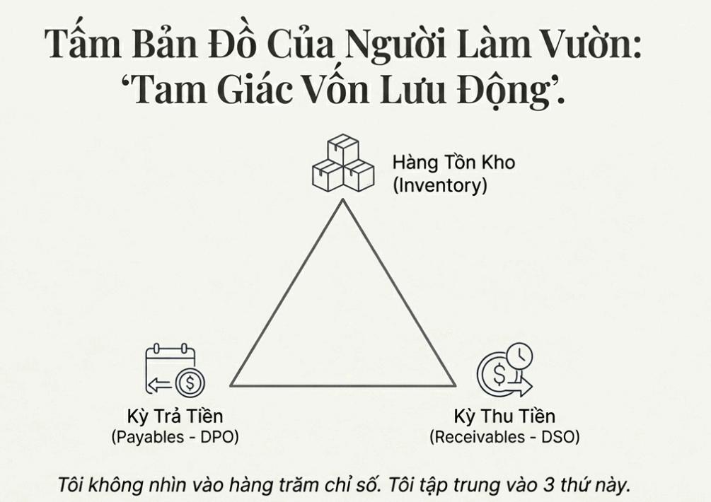 Tôi không nhìn vào hàng trăm chỉ số. Tôi tập trung 3 thứ sau, gọi là “Tam Giác Vốn Lưu Động”: