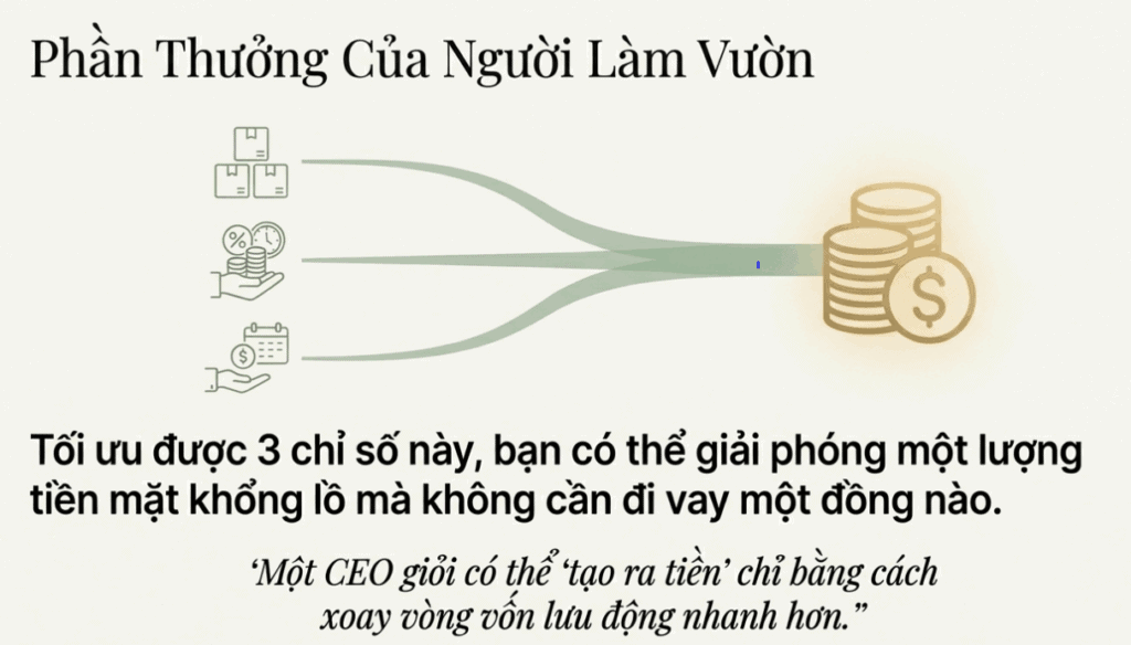 Tư duy thực chiến: Tối ưu được 3 chỉ số này, bạn có thể giải phóng một lượng tiền mặt khổng lồ mà không cần đi vay một đồng nào. Một CEO giỏi có thể “tạo ra tiền” chỉ bằng cách xoay vòng vốn lưu động nhanh hơn.
