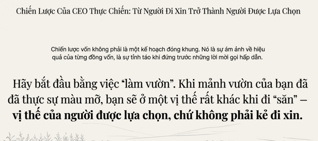 • Hãy bắt đầu bằng việc “làm vườn”: đo lường và cải thiện ngay lập tức 3 chỉ số vốn lưu động. Khi mảnh vườn của bạn đã thực sự màu mỡ, bạn sẽ ở một vị thế rất khác khi đi “săn” – vị thế của người được lựa chọn, chứ không phải kẻ đi xin. Đó mới là chiến lược vốn của một CEO thực chiến.