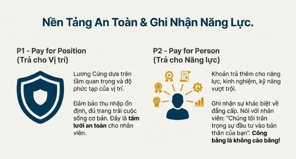 - Để làm gì? Để đảm bảo nhân viên có một khoản thu nhập ổn định, đủ để “cơm ăn áo mặc”, trang trải cuộc sống cơ bản. Đây là nền tảng, là tấm lưới an toàn cho họ.