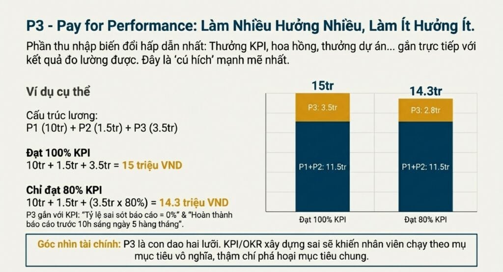 •Bài học: P3 phải gắn trực tiếp với đầu ra đo lường được (doanh số, lợi nhuận gộp, tiết kiệm chi phí). Đây là phần khiến người giỏi cảm thấy công bằng và được đền đáp xứng đáng.