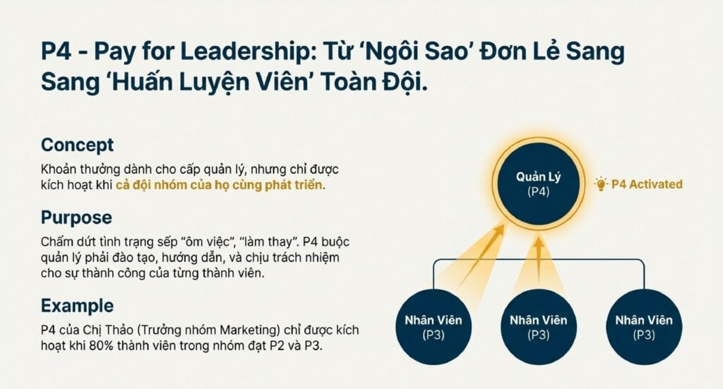 P4 – pay for leadership (trả cho năng lực lãnh đạo): muốn làm sếp, phải biết dạy lính