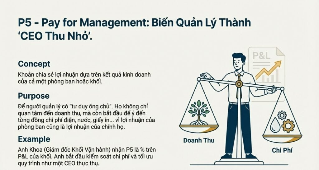 - Ví dụ: Anh Khoa (Giám đốc Khối Vận hành) nhận P5 là một phần trăm nhỏ trên Lợi nhuận và Thua lỗ (P&L) của khối mình. Anh Khoa bắt đầu quan tâm đến việc kiểm soát chi phí điện, nước, văn phòng phẩm và tối ưu hóa quy trình như một CEO thực thụ.