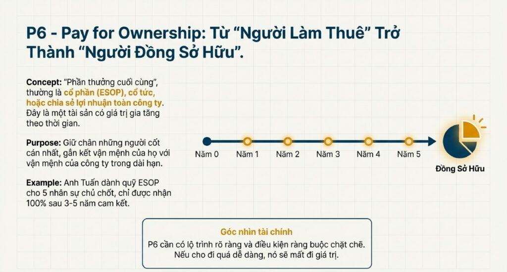 - Ví dụ: Anh Tuấn dành một quỹ ESOP (Cổ phần thưởng cho nhân viên) cho 5 nhân sự chủ chốt. P6 này không phải là tiền lương hàng tháng, mà là quyền sở hữu gắn với lợi nhuận toàn công ty và chỉ được nhận 100% sau 3-5 năm.