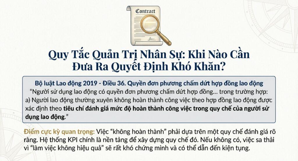 Đây là một điểm cực kỳ quan trọng. Luật pháp cho phép doanh nghiệp đơn phương chấm dứt hợp đồng nếu người lao động “thường xuyên không hoàn thành công việc”. Nhưng việc “không hoàn thành” này phải được xác định dựa trên một quy chế đánh giá rõ ràng. Hệ thống KPI chính là nền tảng để xây dựng nên “tiêu chí đánh giá mức độ hoàn thành công việc” trong quy chế đó. Nếu không có hệ thống này, việc sa thải nhân viên vì lý do “làm việc không hiệu quả” sẽ rất khó để chứng minh và có thể dẫn đến kiện tụng.