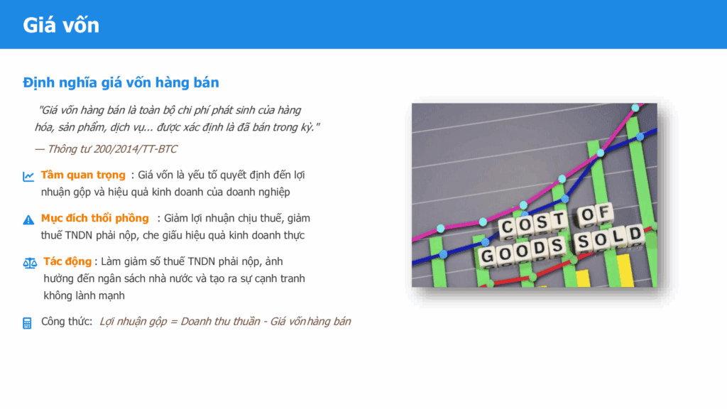 Giá vốn hàng bán, theo định nghĩa đơn giản, chính là tổng chi phí mà doanh nghiệp phải bỏ ra để sản xuất hoặc mua vào những sản phẩm, hàng hóa đã bán được trong kỳ. Khi giá vốn càng cao, lợi nhuận của doanh nghiệp sẽ càng thấp, và do đó số thuế phải nộp cũng sẽ giảm theo. Chính vì lý do này mà việc “thổi phồng” giá vốn trở thành một trong những cách thức phổ biến để trốn thuế.