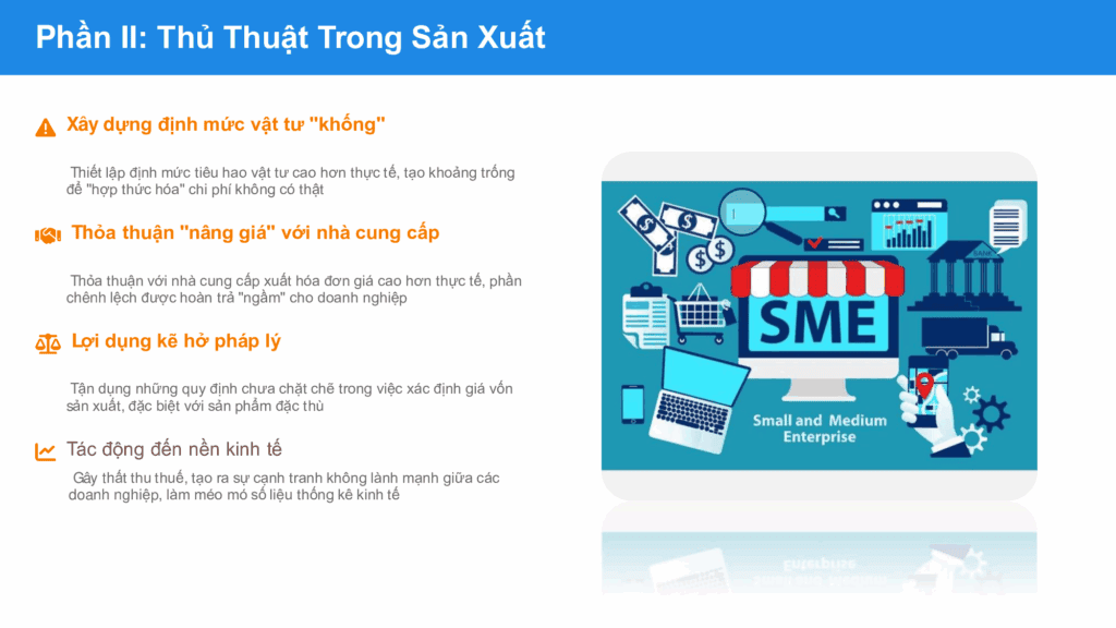 Với Doanh nghiệp, việc quản lý chi phí và tối ưu hóa thuế luôn là mối quan tâm hàng đầu của các doanh nghiệp. Tuy nhiên, không phải tất cả các phương pháp được sử dụng đều minh bạch và tuân thủ đúng quy định pháp luật. Đặc biệt, nhiều doanh nghiệp nhỏ và vừa (DNNVV) đã và đang áp dụng những “thủ thuật” để tăng giá vốn hàng bán nhằm giảm lợi nhuận trên sổ sách, từ đó giảm nghĩa vụ thuế thu nhập doanh nghiệp.