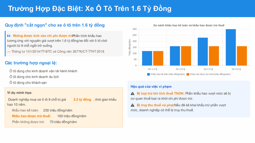 Một trong những quy định đặc biệt trong luật thuế Việt Nam là về khấu hao xe ô tô có giá trị trên 1,6 tỷ đồng. Theo Thông tư 151/2014/TT-BTC, phần trích khấu hao tài sản cố định tương ứng với phần nguyên giá vượt trên 1,6 tỷ đồng/xe đối với ô tô chở người từ 9 chỗ ngồi trở xuống không được tính vào chi phí được trừ khi xác định thu nhập chịu thuế.