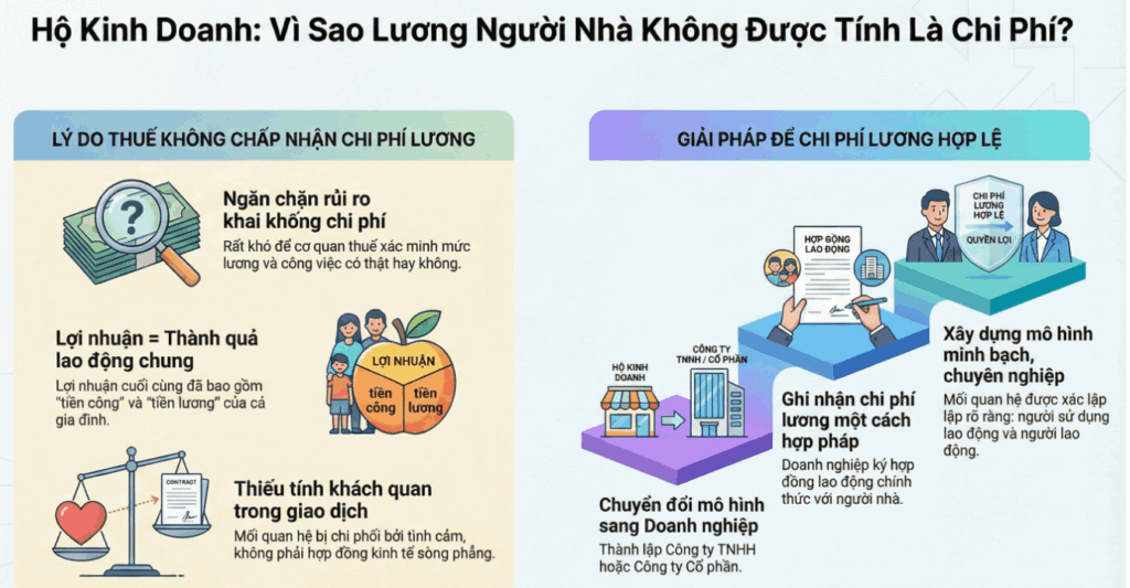- Rủi ro khai khống chi phí: Nếu luật cho phép, sẽ có vô số trường hợp lạm dụng. Một hộ kinh doanh có thể dễ dàng kê khai trả lương cho cả ông bà, cha mẹ, con cái (dù họ chỉ tham gia phụ giúp rất ít) với mức lương cao để làm giảm thu nhập tính thuế. Việc cơ quan thuế đi xác minh từng trường hợp xem mức lương đó có hợp lý không, công việc đó có thật không… là một nhiệm vụ bất khả thi và tốn kém nguồn lực xã hội.