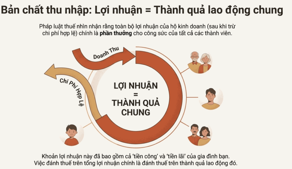 - Bản chất của thu nhập: Đối với mô hình hộ kinh doanh, pháp luật thuế nhìn nhận rằng toàn bộ lợi nhuận thu được sau khi trừ các chi phí hợp lệ (như tiền hàng, điện, nước, thuê mặt bằng…) chính là thành quả lao động chung của cả gia đình. Khoản lợi nhuận này đã bao gồm “tiền công”, “tiền lương” của những người tham gia. Việc đánh thuế trên tổng lợi nhuận này chính là đánh thuế trên thành quả lao động đó.