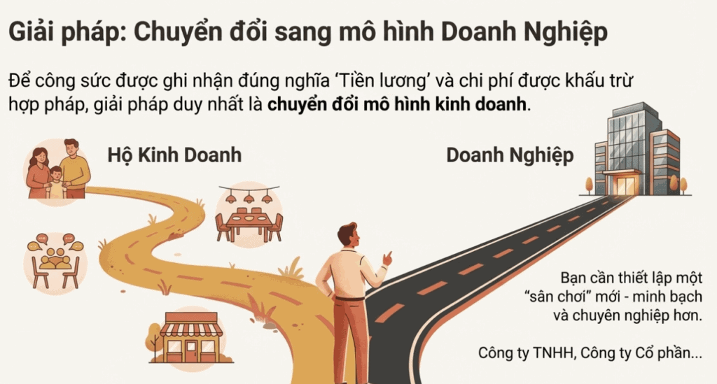 Giải pháp duy nhất là chuyển đổi mô hình kinh doanh sang Doanh nghiệp (Công ty TNHH, Công ty Cổ phần).