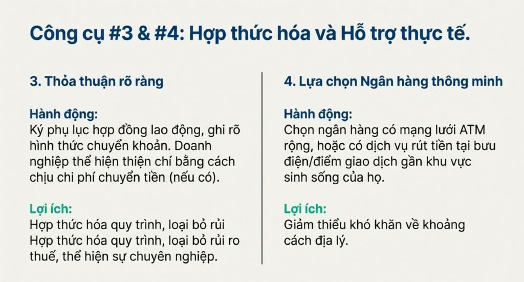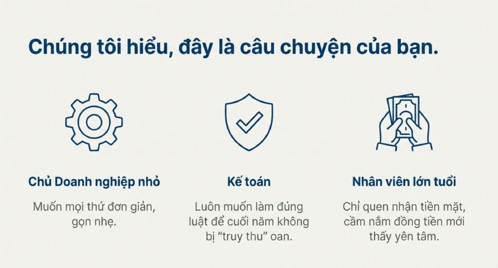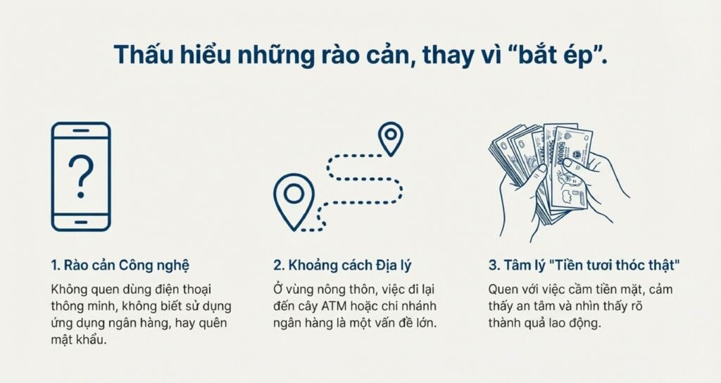 Trong nhiều doanh nghiệp nhỏ, đặc biệt là các ngành sản xuất, dịch vụ, chúng ta có những cô chú, anh chị lớn tuổi – những người thợ lành nghề, giàu kinh nghiệm. Họ là tài sản quý giá, nhưng lại là nhóm khó chuyển đổi nhất sang hình thức nhận lương qua ngân hàng.