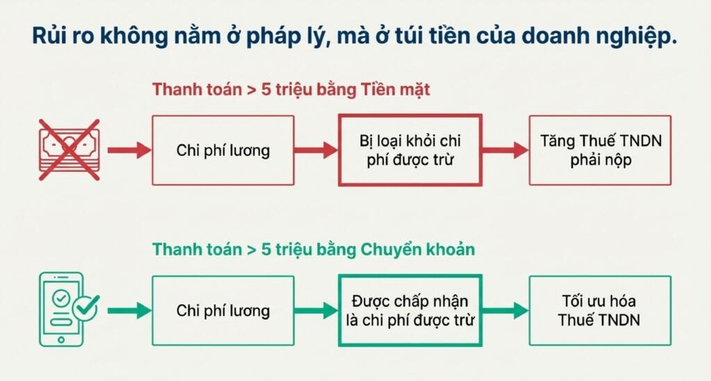 Nguyên tắc ngầm: Mọi khoản chi phí lớn (thường là từ 5 triệu đồng trở lên) nếu muốn được cơ quan thuế chấp nhận là chi phí hợp lý, được trừ khi tính thuế TNDN, thì cần phải có chứng từ thanh toán không dùng tiền mặt (chuyển khoản) để đảm bảo tính minh bạch và truy vết .