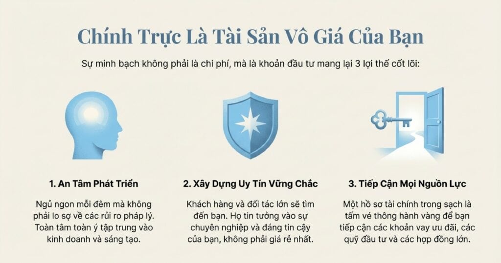 Ngược lại, sự chính trực và minh bạch chính là tài sản quý giá nhất của bạn. Có thể hôm nay bạn gặp khó khăn về giá, nhưng bạn đang xây dựng một thương hiệu bền vững dựa trên uy tín và sự tuân thủ pháp luật. Chỉ có sự minh bạch mới giúp bạn:
