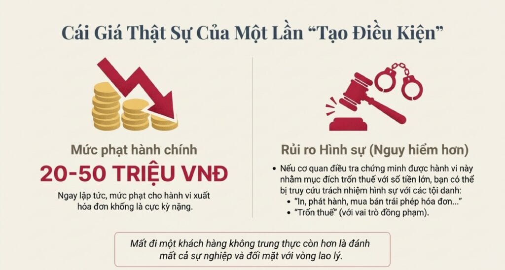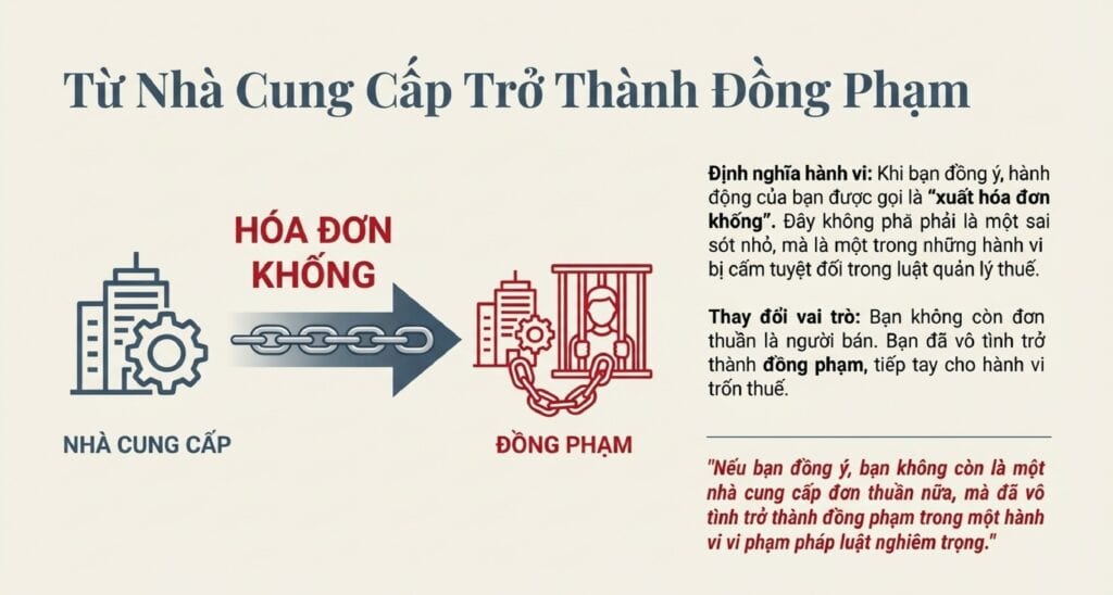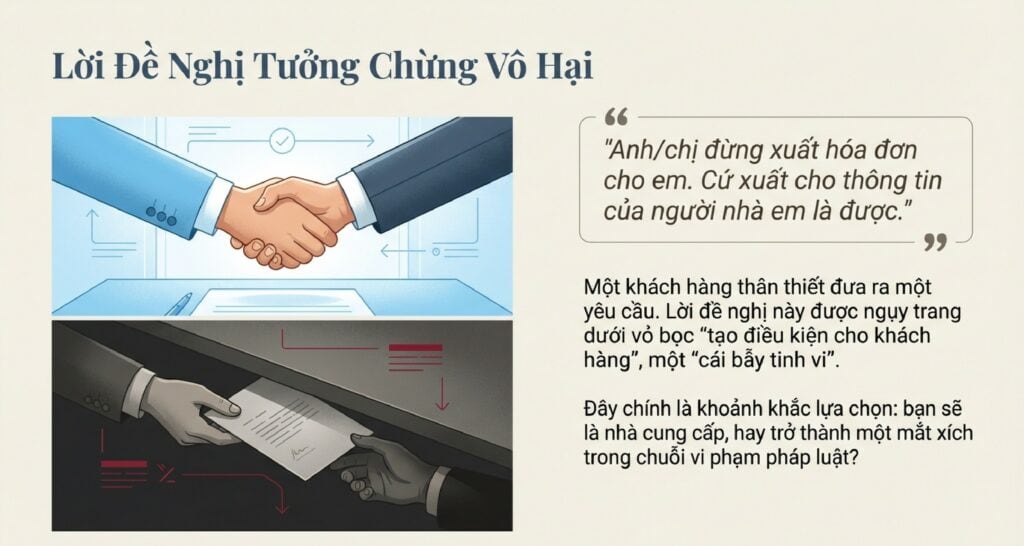 Đây là một lời đề nghị vô cùng nguy hiểm, một cái bẫy tinh vi khoác lên mình vỏ bọc của việc “tạo điều kiện cho khách hàng”. Nếu bạn đồng ý, bạn không còn là một nhà cung cấp đơn thuần nữa, mà đã vô tình trở thành đồng phạm trong một hành vi vi phạm pháp luật nghiêm trọng.
