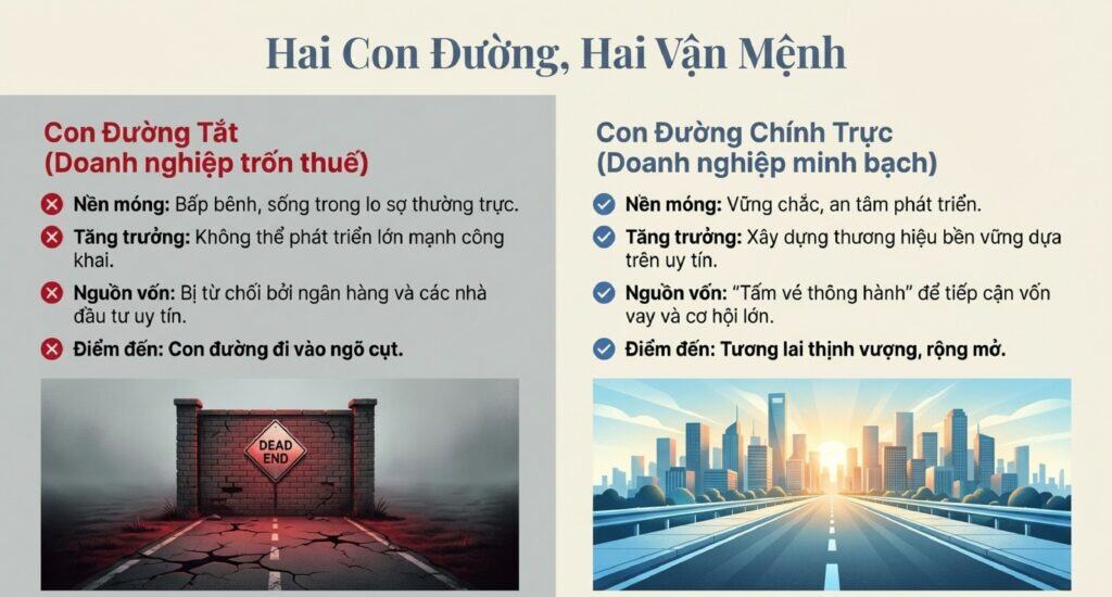 Doanh nghiệp trốn thuế có thể có lợi thế về giá trong ngắn hạn, nhưng họ đang kinh doanh trên một nền móng vô cùng bấp bênh. Họ sống trong sự lo sợ thường trực bị phát hiện, bị truy thu và phạt nặng. Họ không thể phát triển lớn mạnh một cách công khai, không thể tiếp cận các nguồn vốn vay chính thức từ ngân hàng, không thể tham gia vào các dự án lớn hay trở thành đối tác của các tập đoàn uy tín. Con đường của họ là con đường đi vào ngõ cụt.