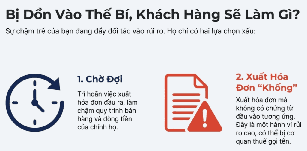 - Chờ đợi bạn xuất hóa đơn – Điều này có nghĩa là họ phải trì hoãn việc xuất hóa đơn đầu ra, làm chậm quy trình kinh doanh của họ.