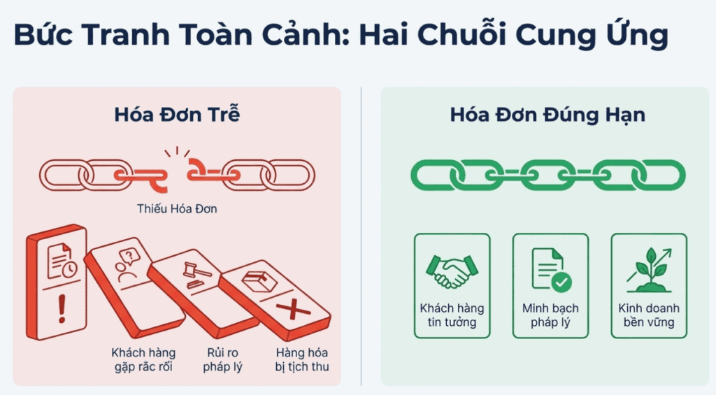 Khi bạn không xuất hóa đơn đúng thời điểm, bạn không chỉ ảnh hưởng đến nghĩa vụ thuế của mình. Bạn còn làm suy yếu chuỗi chứng cứ pháp lý của toàn bộ chuỗi giao dịch.